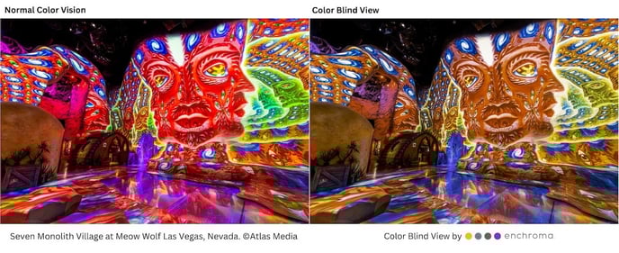 Yes, Meow Wolf offers EnChroma glasses for people with red-green color blindness. These special glasses help people see a broader range of colors more vividly, enhancing details and depth perception.
